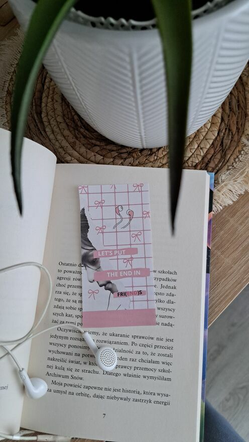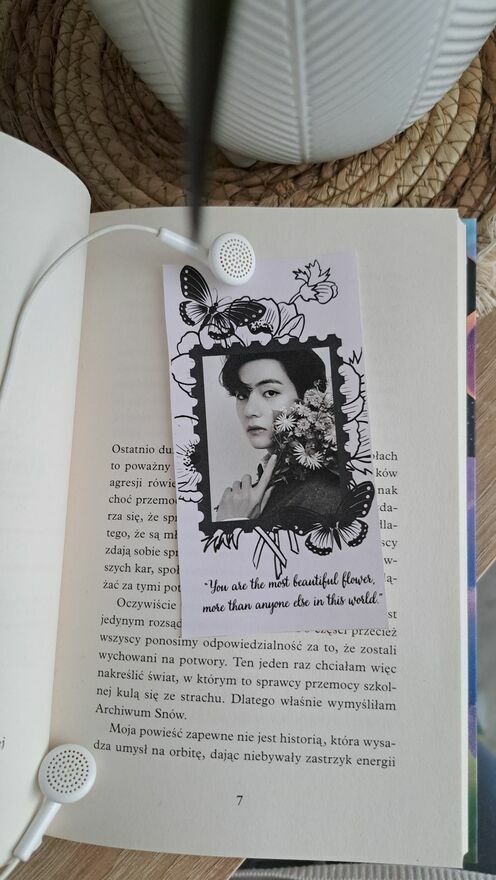 Autorski projekt zakładki do książki z zespołem BTS, a konkretnie z jednym z członków V, w kwiecistym klimacie i cytatem autorstwa V. A także zakładka inspirowana jego solowym utworem Fri(end)s w różowo-białej kolorystyceAleksandra